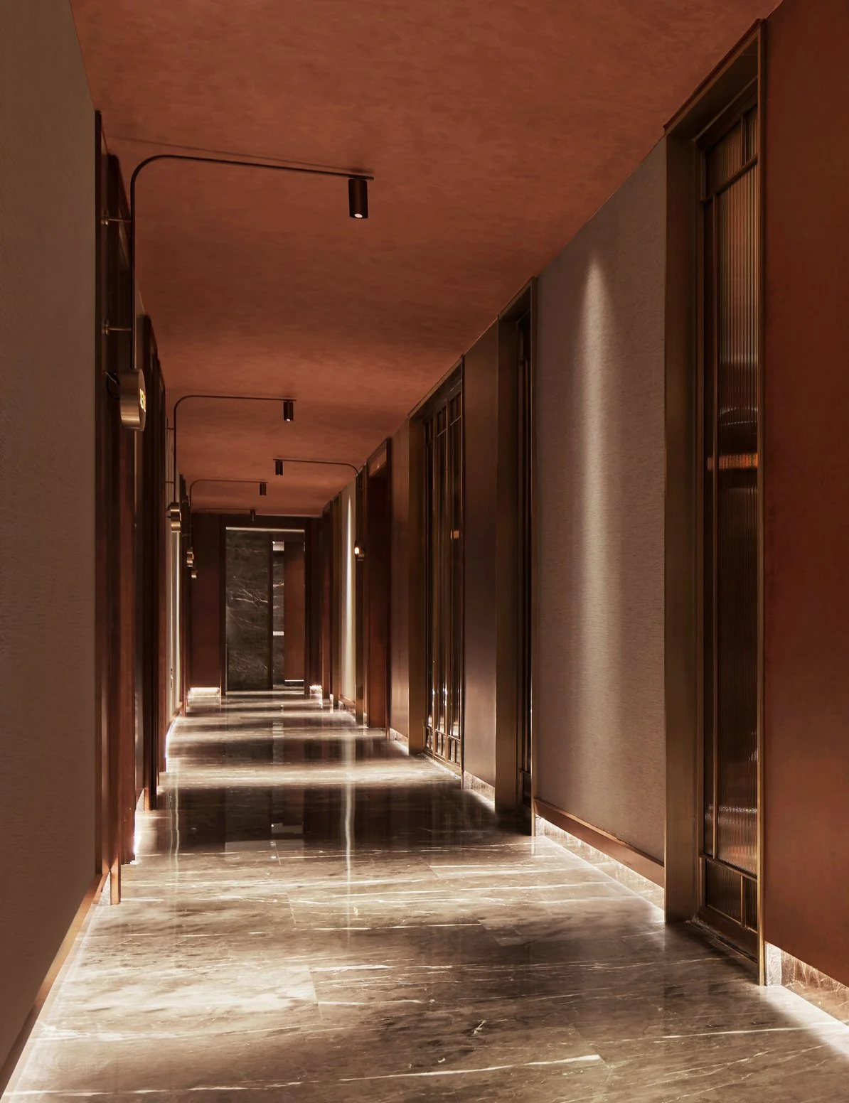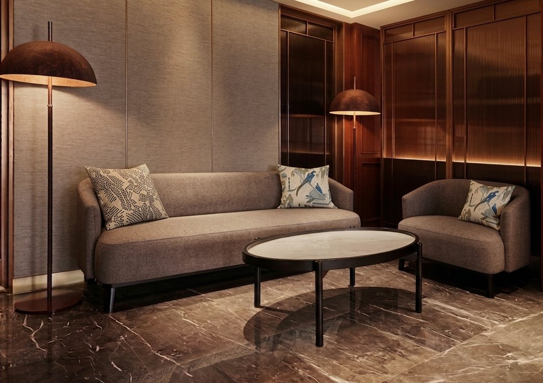 In the main dining hall, rosewood panels gleam beneath soft light, framing sleek modern furnishings that speak both of tradition and tomorrow. Vivid orange leather chairs punctuate the room like brushstrokes of energy and youth, inviting guests of all generations to gather, to share, to savor.